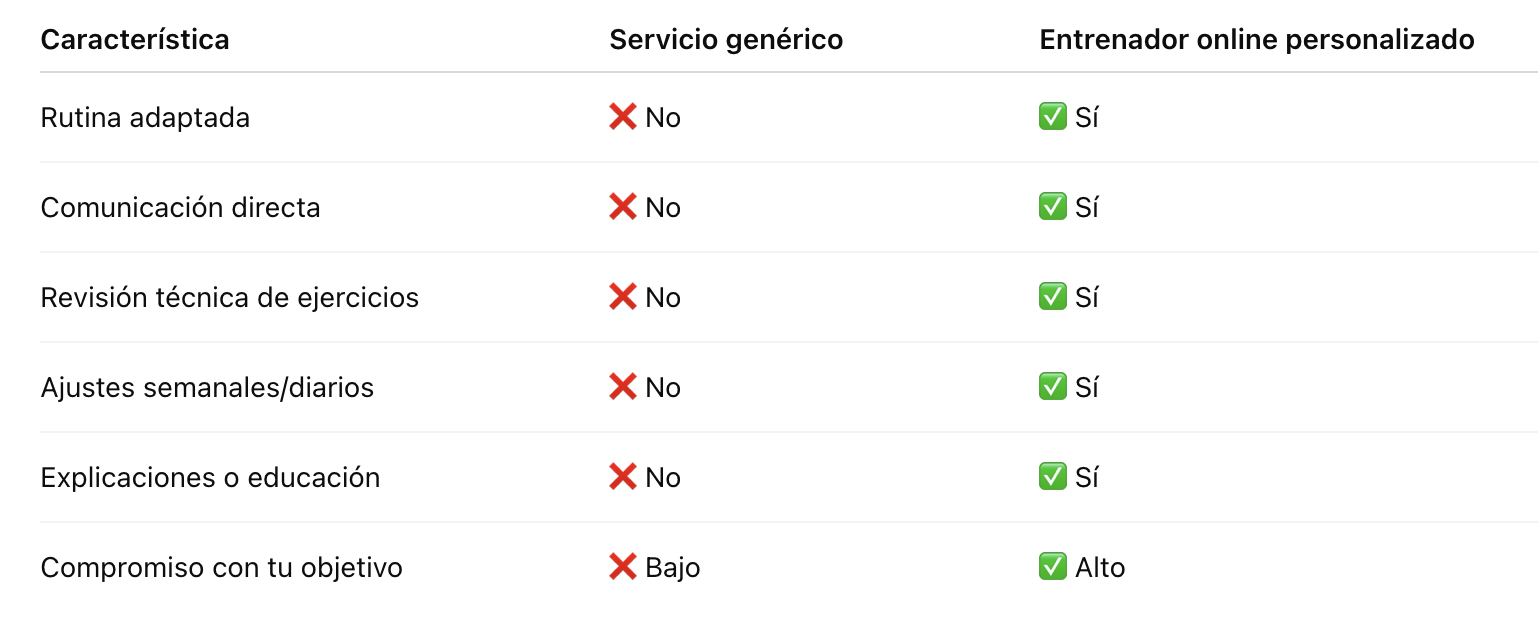 Cuando pagas por un entrenador online serio, no estás comprando "una rutina" ni "unos vídeos". Estás invirtiendo en: